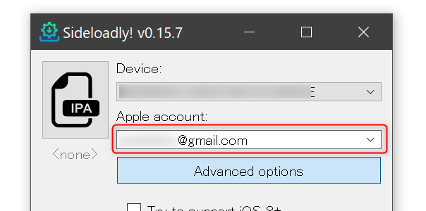 ipaファイルが読み込まれ、「Advanced options」ボタンの左にファイル名が表示されます。